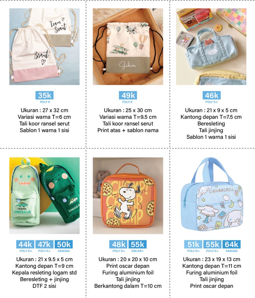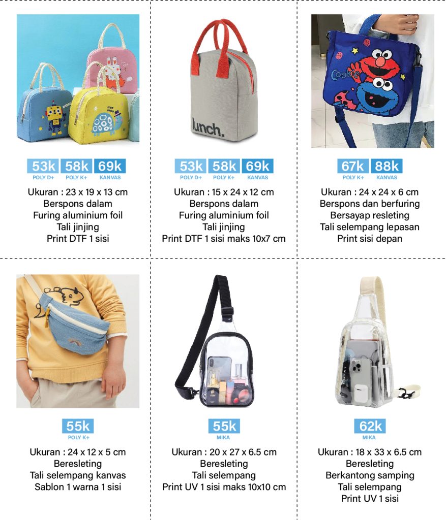 Tas Souvenir Ulang Tahun Anak. Bisa ditambahkan tema gambar ataupun logo. Bahan fabric mulai polyester dinier, nilon, dolby, blacu sampai kanvas. Tas Lunchbox. Tas Kotak Makan. Tas Kursus. Tas Travel. Tas Map. Goodie Bag.