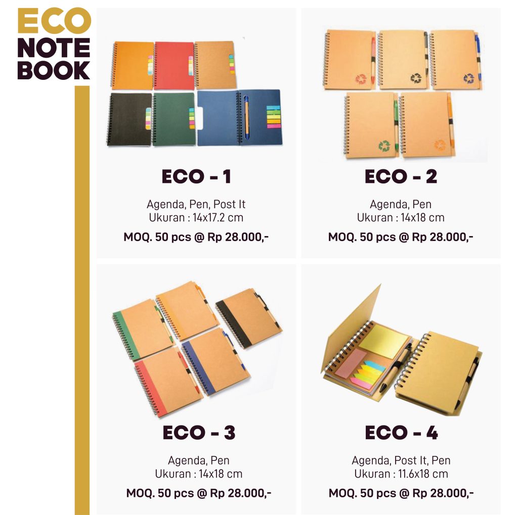 Tentu saja tersedia dalam berbagai model di bawah. Ada yang lengkap dengan post it, untuk memudahkan memberi penanda pada halaman atau pernyataan tertulis tertentu. Ada pula yang dengan mini pouch, sebagai tempat penyimpanan alat tulis, flashdisk penyerta dan lain-lain.